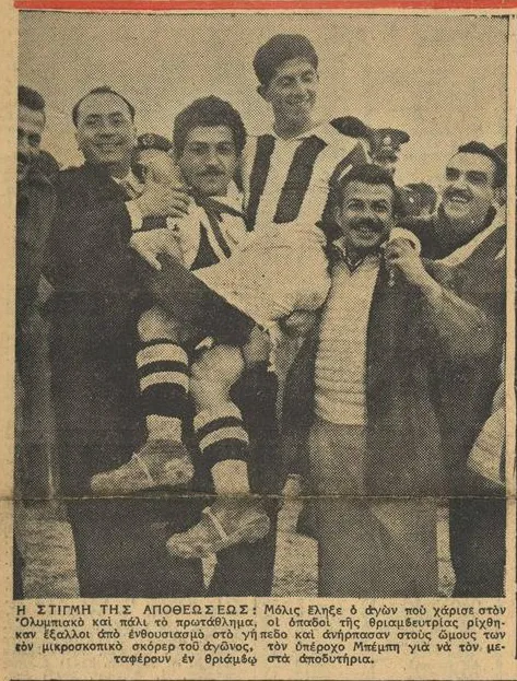 20-2-1955 πρώτη μέρα της τελικής φάσης του πρωταθλήματος…με Απόλλωνα στη Λεωφόρο. Ο Μπέμπης, ερυθρόλευκος πλέον, ανοίγει το σκορ στο 9ο λεπτό και ο Δρόσος στην επανάληψη κάνει το τελικό 2-0