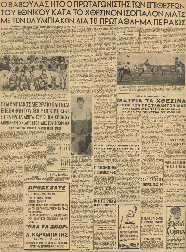 ΟΣΦΠ 33,ΕΘΝΙΚΟΣ-ΠΑΝΕΛΕΥΣΙΝΙΑΚΟΣ 30,ΠΡΟΟΔΕΥΤΙΚΗ 24,ΑΤΡΟΜΗΤΟΣ Π. 23,Α.Ε.ΝΙΚΑΙΑΣ 20,ΑΡΓΟΝΑΥΤΗΣ 17,ΘΗΣΕΑΣ 15.