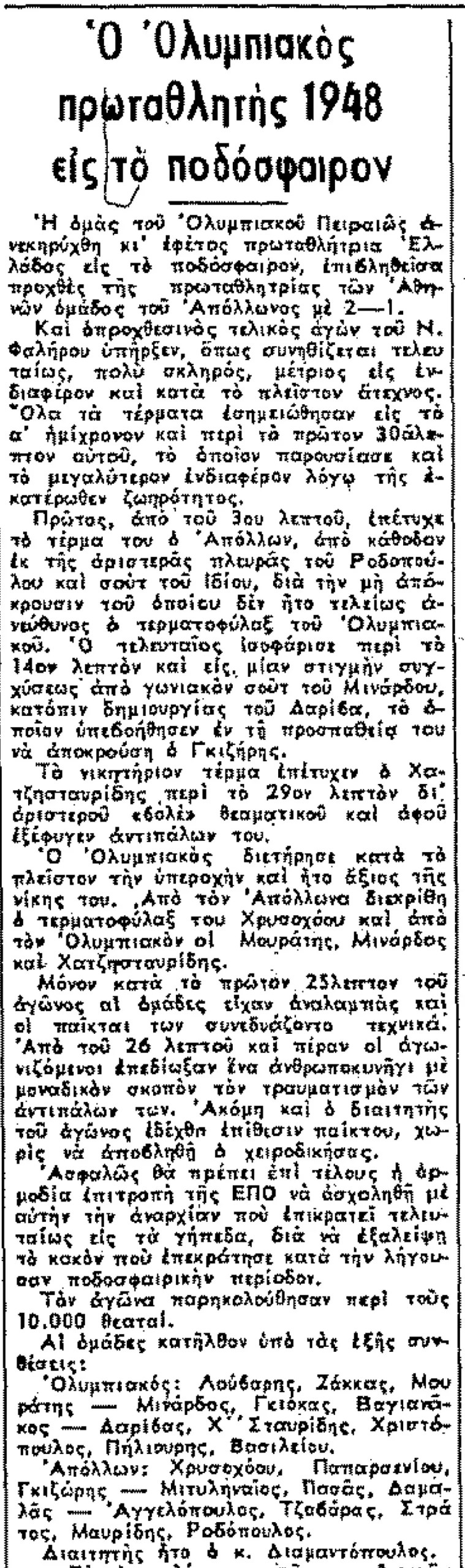 | ΟΛΥΜΠΙΑΚΟΣ – ΑΠΟΛΛΩΝ ΑΘΗΝΩΝ 2-1 |