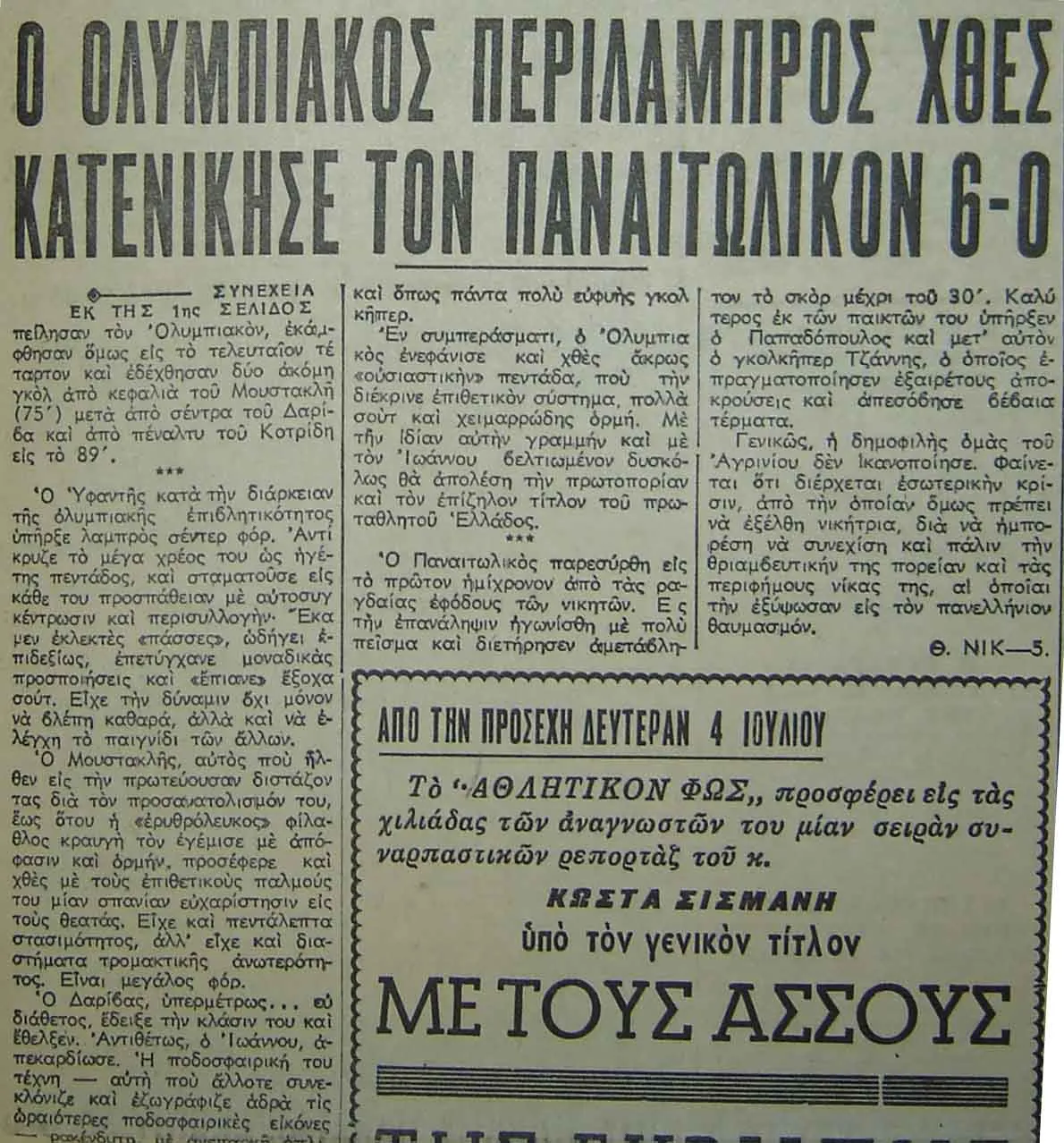 | ΟΛΥΜΠΙΑΚΟΣ – ΠΑΝΑΙΤΩΛΙΚΟΣ 6-0 |