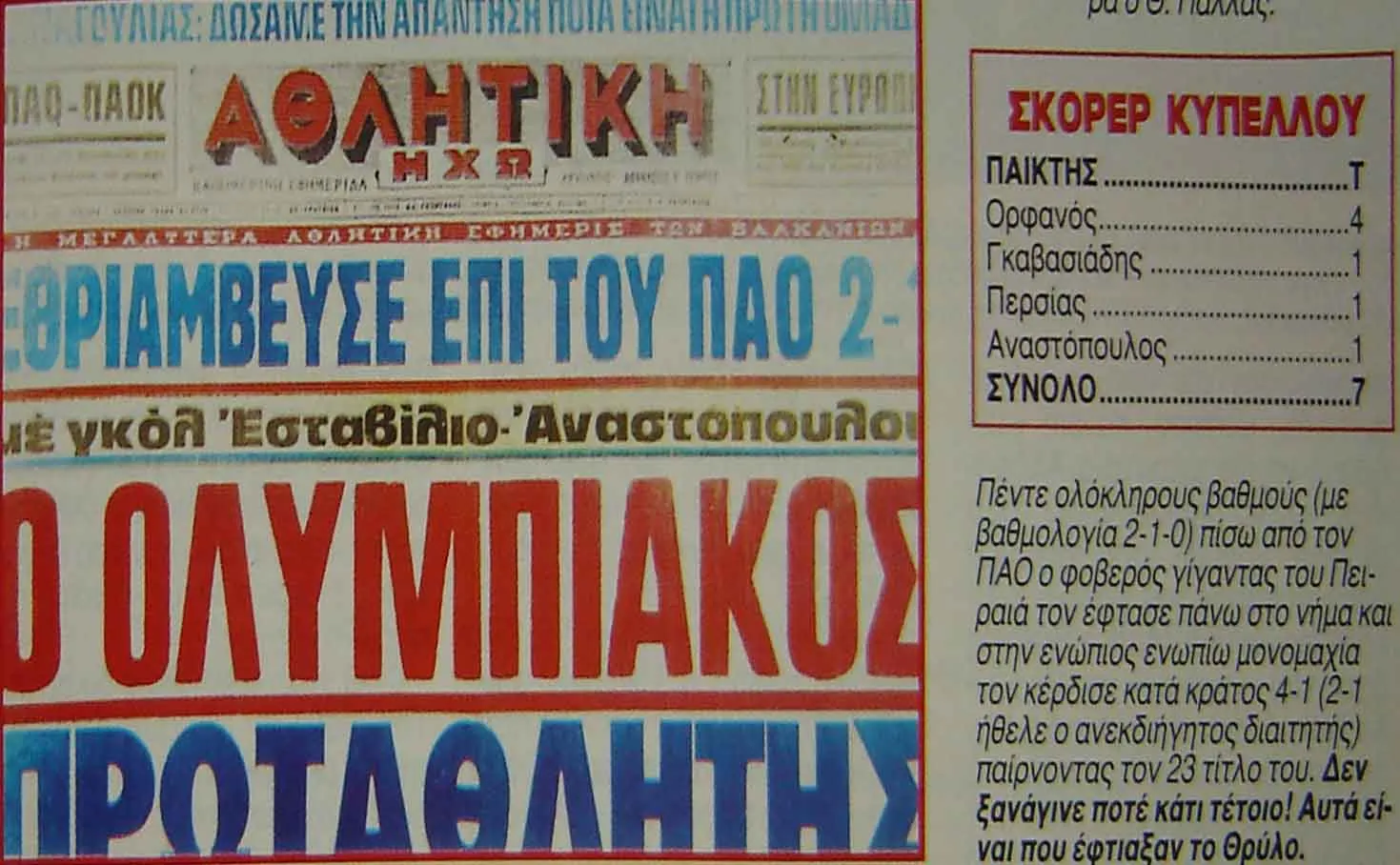 | ΟΛΥΜΠΙΑΚΟΣ – ΠΑΝΑΘΗΝΑΪΚΟΣ 2-1 |