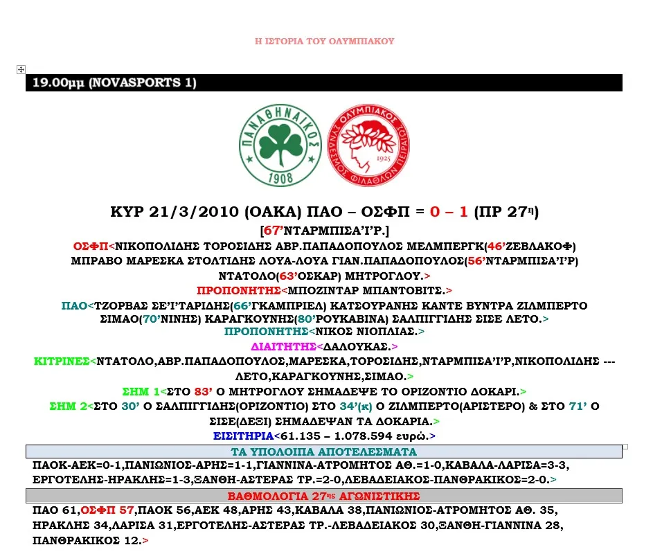 ΟΛΟΙ ΟΙ ΑΓΩΝΕΣ ΤΟΥ ΟΛΥΜΠΙΑΚΟΥ