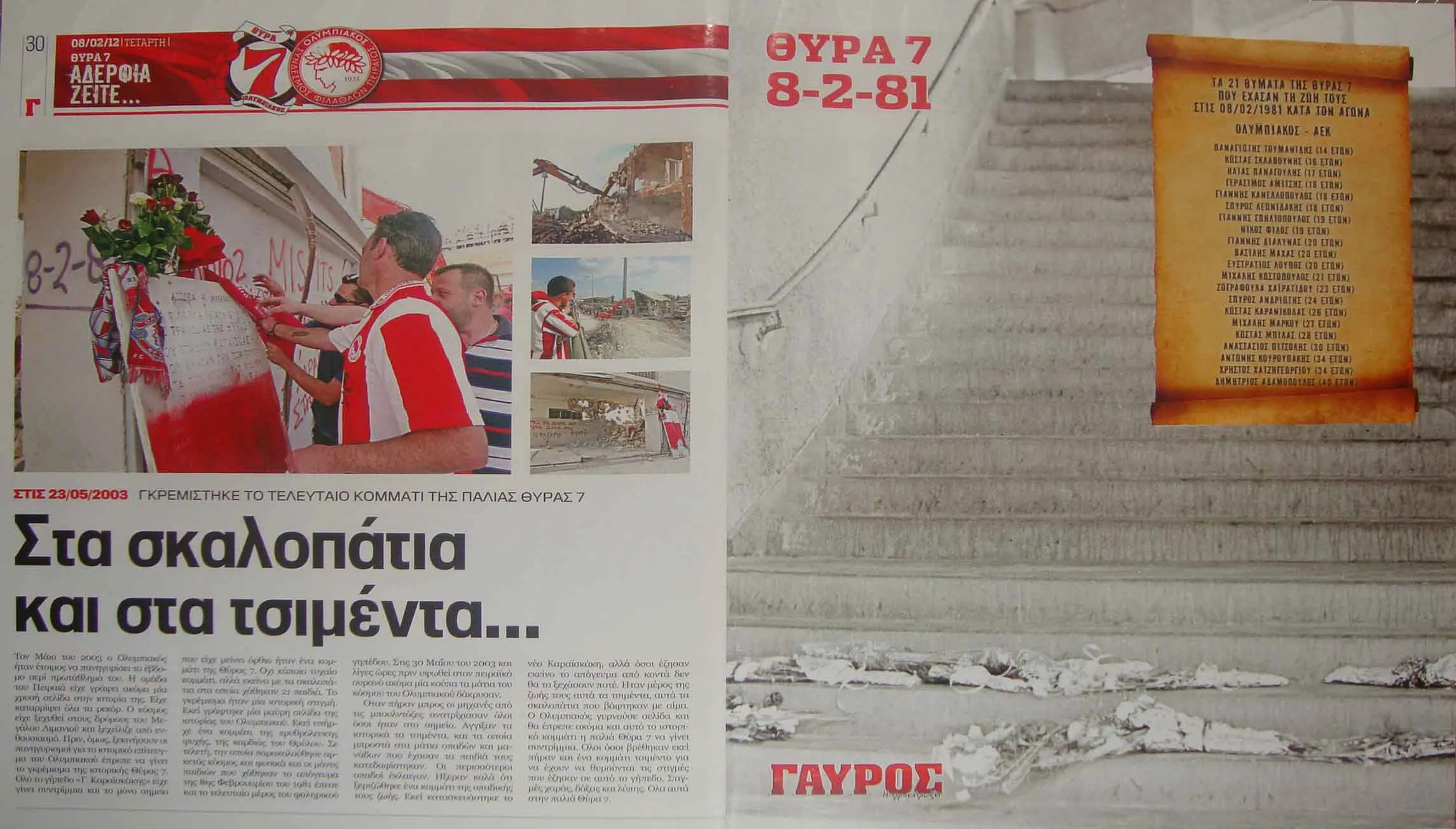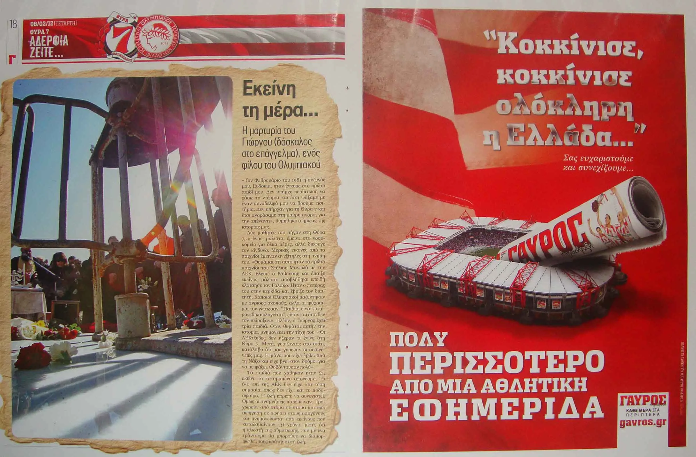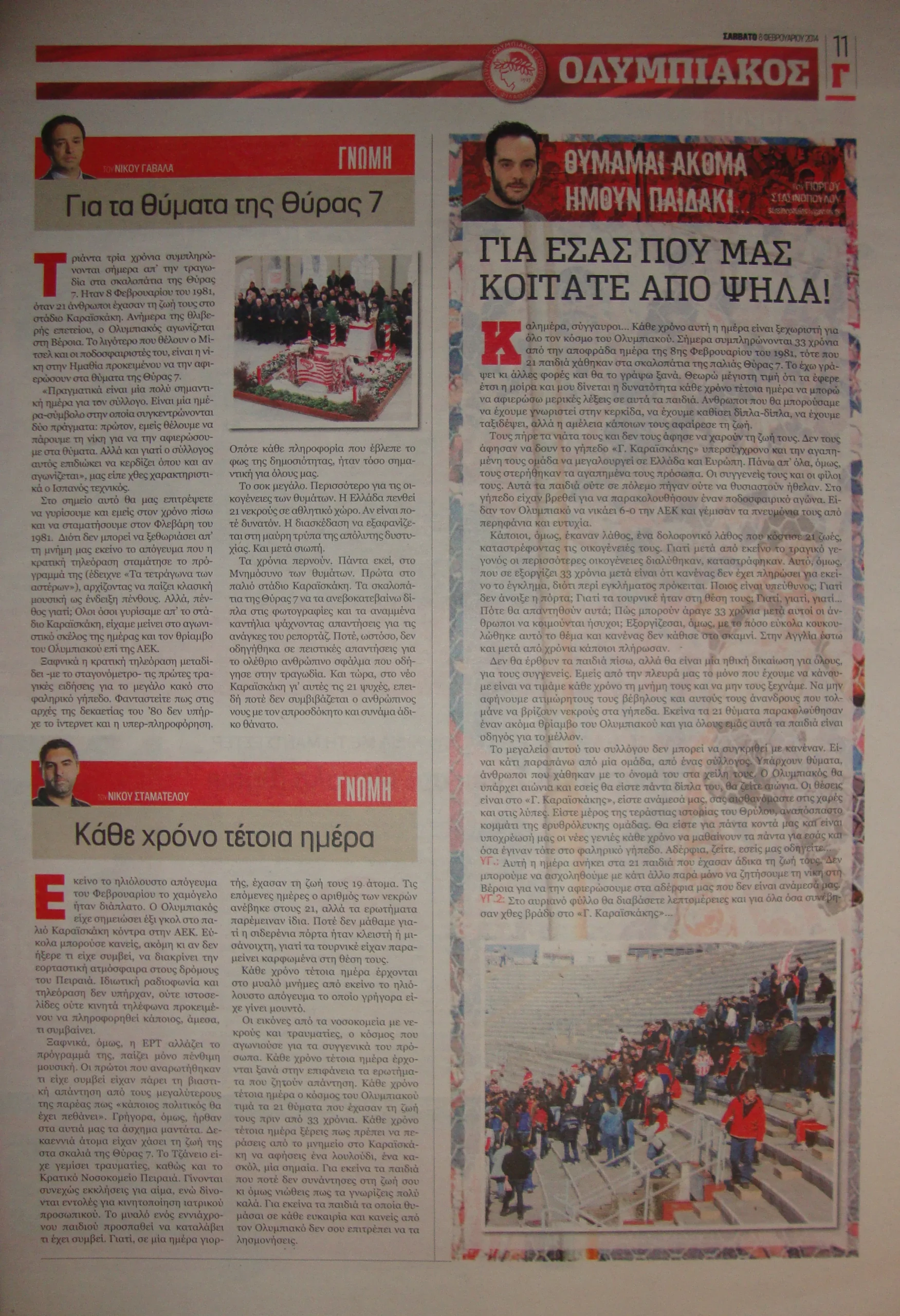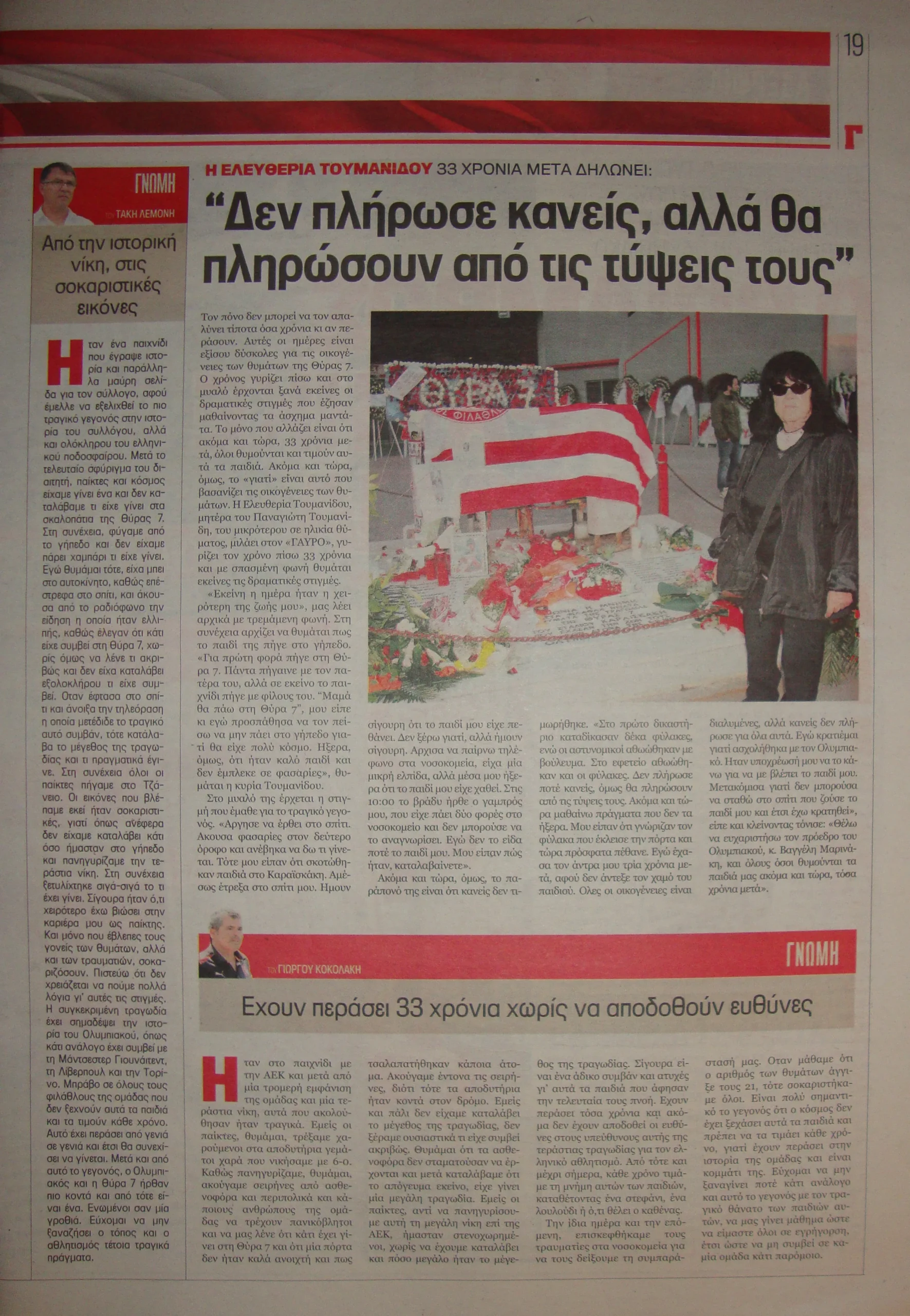 Ο αναγνώστης σε αυτό το σημείο θα συγχωρήσει την οργή και τον προσωπικό τόνο, ο γράφων ήταν στη Θύρα 7 εκείνη την αποφράδα ημέρα και ήταν από τους τυχερούς. Μόνο οργή μπορεί να αισθανθεί κάποιος για τους υπεύθυνους και, ως οπαδός του Ολυμπιακού, διπλή οργή για τη διοίκησή του. Όχι μόνο δεν πρωτοστάτησε έστω στην αποκάλυψη των αληθινών αιτίων της τραγωδίας και των υπευθύνων, αλλά επιχείρησε να παρουσιάσει τις εγκληματικές παραλείψεις ως «θυσία» για την «ιδέα του Ολυμπιακού». Προφανώς κανένας δεν πάει στο γήπεδο για να θυσιαστεί (!) για μια ποδοσφαιρική ομάδα, κάθε τέτοια αναφορά κρύβει σκοπιμότητες και αποτελεί προσβολή στη μνήμη των νεκρών.