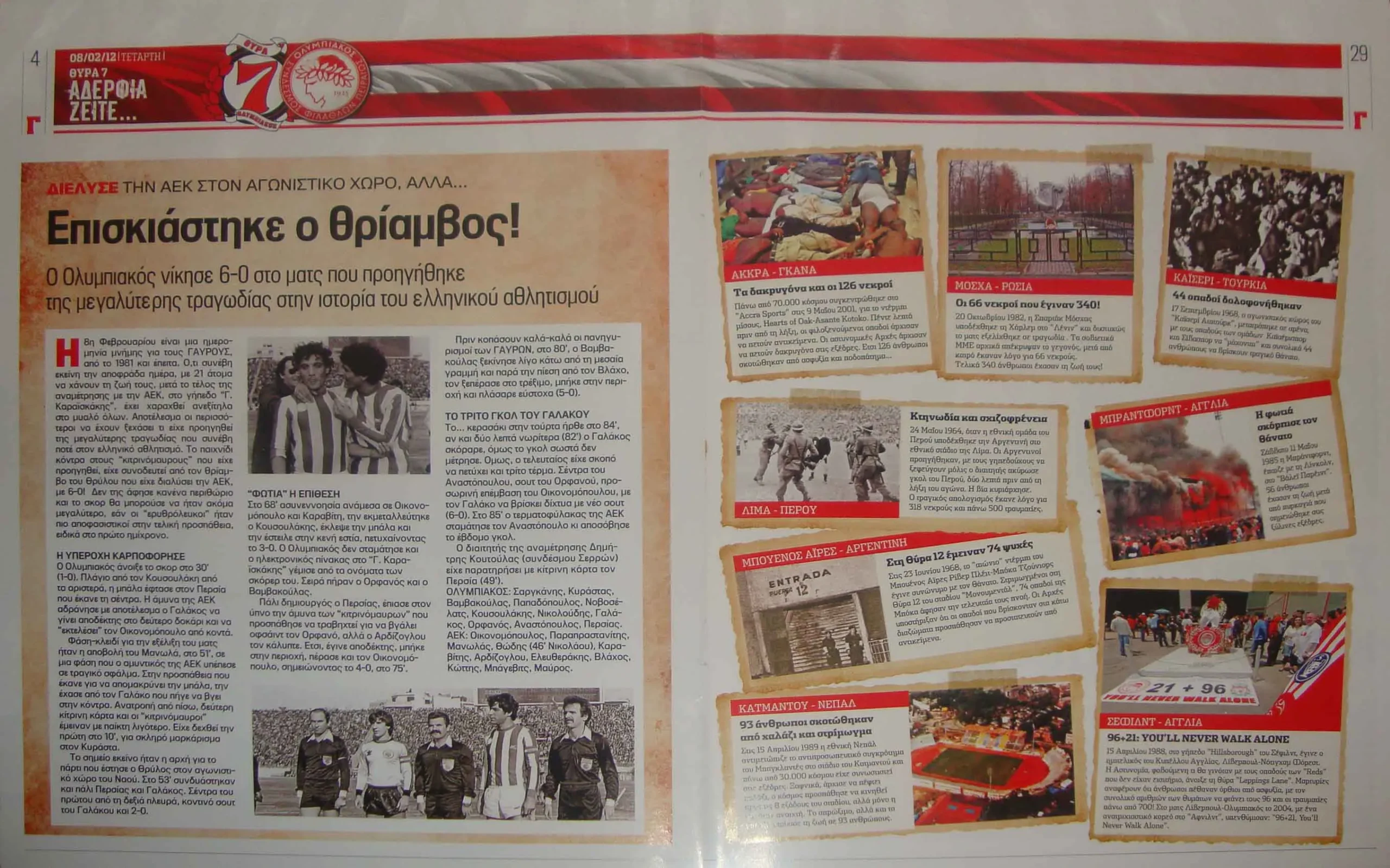 Όμως, όλες αυτές οι όμορφες ποδοσφαιρικές ιστορίες καλύφθηκαν από ένα μαύρο σύννεφο το απόγευμα της 8ης Φεβρουαρίου 1981, αν και η μέρα ήταν ηλιόλουστη. Ο Ολυμπιακός υποδεχόταν την ΑΕΚ στο Φάληρο οι «Ερυθρόλευκοι», με ηγέτη τον Γαλάκο που σημείωσε τρία γκολ, πετυχαίνουν μια ιστορική νίκη: 6-0! Το «Καραϊσκάκης» χορεύει στους ρυθμούς της ομάδας και όλοι τρέχουν να βγουν για να συνεχιστεί το πανηγύρι στους δρόμους, προπάντων οι φανατικοί οπαδοί της Θύρας 7.