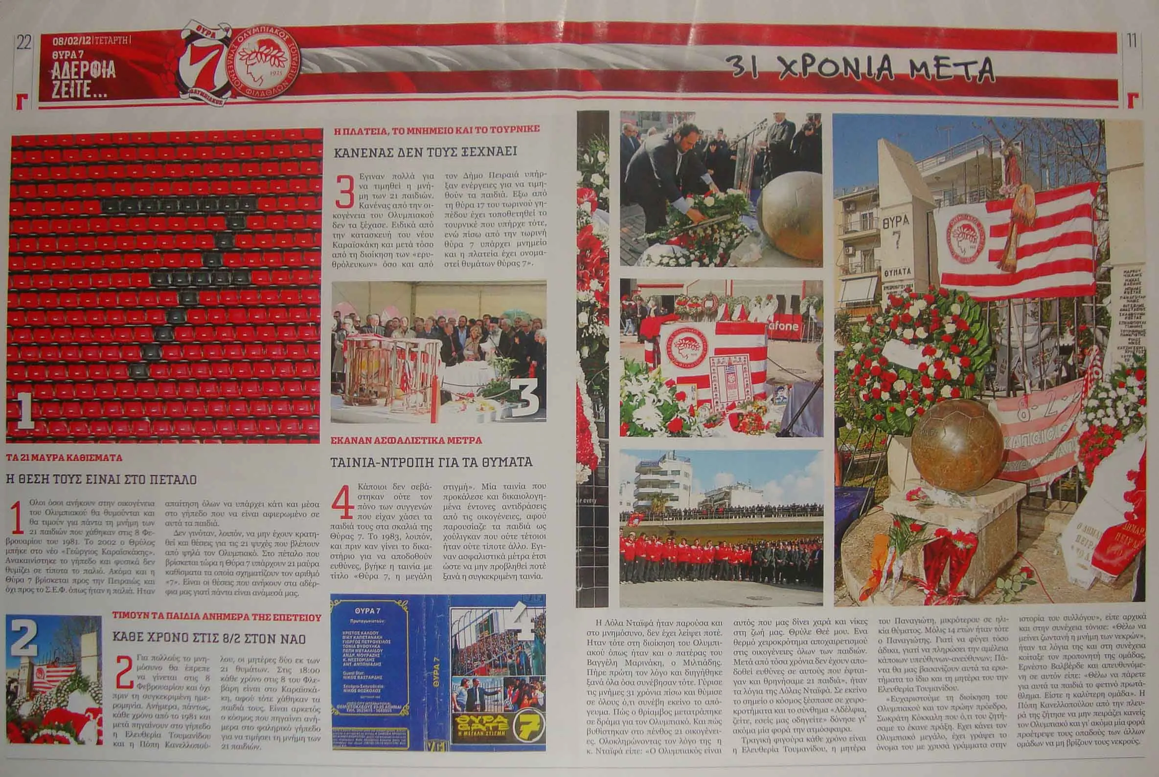 Τα γεγονότα είναι γνωστά: οι κλειστές πόρτες στη Θύρα 7, τα τουρνικέ και η τραγωδία με τους είκοσι έναν νεκρούς νέους ανθρώπους, η πιο μαύρη μέρα στην ιστορία του Ολυμπιακού και του ελληνικού ποδοσφαίρου γενικότερα. Μεγάλη η συζήτηση για τις κατασκευαστικές αστοχίες που πολλά χρόνια πριν είχαν επισημανθεί, είχαν συμβεί αντίστοιχα περιστατικά που ευτυχώς δεν είχαν την ίδια τραγική κατάληξη.